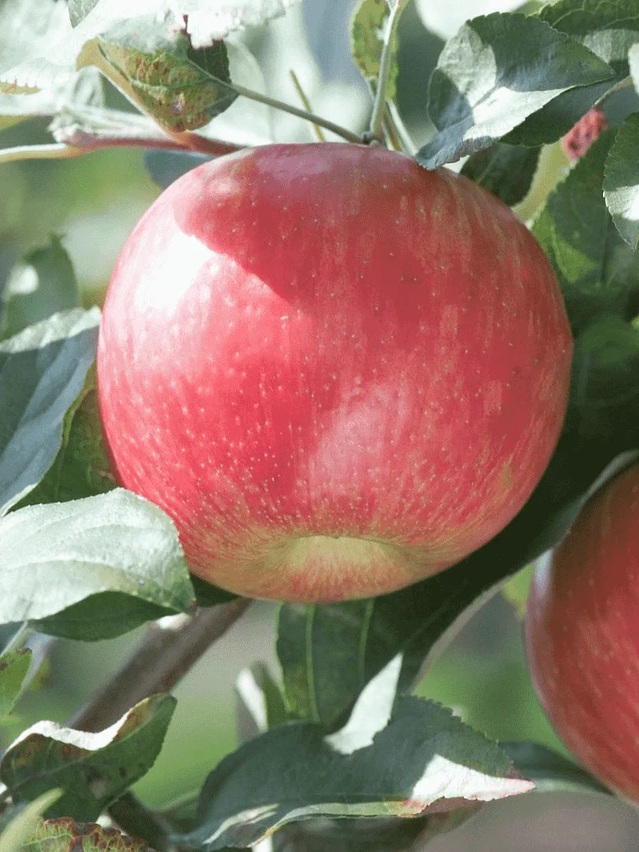 Этот сорт легко узнать в саду по гармоничному виду дерева и очень нарядным плодам. Дерево среднерослое, обычно достигает высоты около 3 метров, что делает уход за ним и сбор урожая комфортным. Крона не склонна к сильному загущению, что является большим плюсом — меньше работы с секатором и лучше естественная вентиляция, снижающая риск болезней.