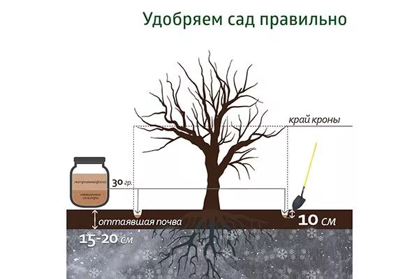 - С приходом осени деревья удобряйте комплексными подкормками без азота: 40 г Суперфосфата, 20 г калия и 20 г кальция.