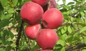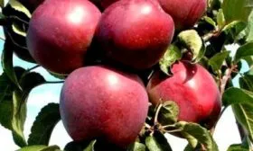 Плоды — главная гордость сорта. Они крупные, массой 150-200 граммов, имеют правильную шаровидную форму. Основной окрас — насыщенный красный, который покрывает почти всю поверхность яблока. Мякоть сочная, мелкозернистая, белого цвета.