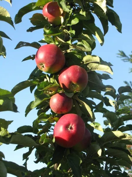 Внешний вид этой яблони кардинально отличается от привычных раскидистых деревьев. Это стройная «колонна» высотой около 2,2 метра, с очень короткими боковыми веточками (копьеца и кольчатки), отходящими от центрального проводника под острым углом. Такая архитектура позволяет размещать саженцы на расстоянии всего 0,6-0,8 метра друг от друга, что является ключевой особенностью колонновидных форм. Листва насыщенно-зеленая, густая, что придает дереву декоративный вид в течение всего сезона.