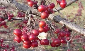 После цветения начинается завязывание плодов, которое у этого скороплодного сорта может наступить уже на 2-4 год. Многочисленные мелкие яблочки, созревающие к осени, полностью преображают дерево. Из зеленого шатра оно превращается в яркий шар, переливающийся желто-красными красками, который сохраняет привлекательность даже после листопада.