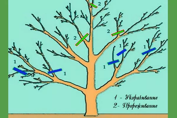 - В первый год укорачивают ветви и центральный ствол примерно на треть от их длины, оставляя не более трёх-четырёх скелетных веток на разной высоте с достаточным расстоянием друг от друга.