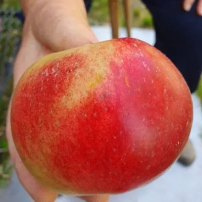 Плоды у этого сорта действительно выдающиеся, особенно для колонновидной формы. Их масса стабильно превышает 180 граммов. Форма приплюснуто-округлая, с ярко выраженной широкой ребристостью, которая наиболее заметна у чашечки.