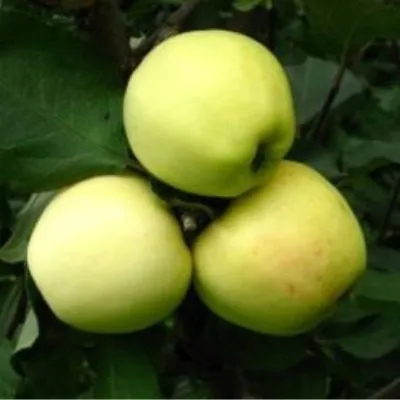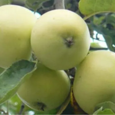 Основной окрас в момент съема — спокойный желто-зеленый. Яркого покровного румянца, как у многих коммерческих сортов, у этих яблок не образуется. Однако при полном созревании на солнечной стороне кроны может проступать нежный, размытый розоватый «загар». Часто на кожице заметен легкий сизоватый или белесый восковой налет (пруин), который является естественной защитой плода.