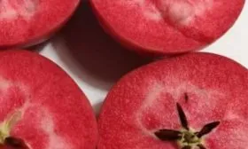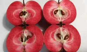 Главная отличительная черта сорта раскрывается при разрезании яблока. Мякоть имеет равномерную, интенсивную розово-красную окраску, которая распространяется от самой кожицы до сердцевины. Это стабильный сортовой признак, не зависящий от степени освещенности плода на дереве.