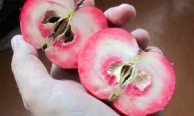 Такая мякоть не только эффектно выглядит в свежих нарезках и салатах, но и указывает на высокое содержание антоцианов — природных антиоксидантов. Вкус плодов сложный и утонченный, с выраженными ягодными тонами. Дегустаторы часто отмечают легкий микс, напоминающий лесные ягоды, такие как малина и черника, что выделяет Ред Пэшн среди сортов с традиционным яблочным вкусовым профилем. Аромат у плодов сильный и приятный.