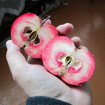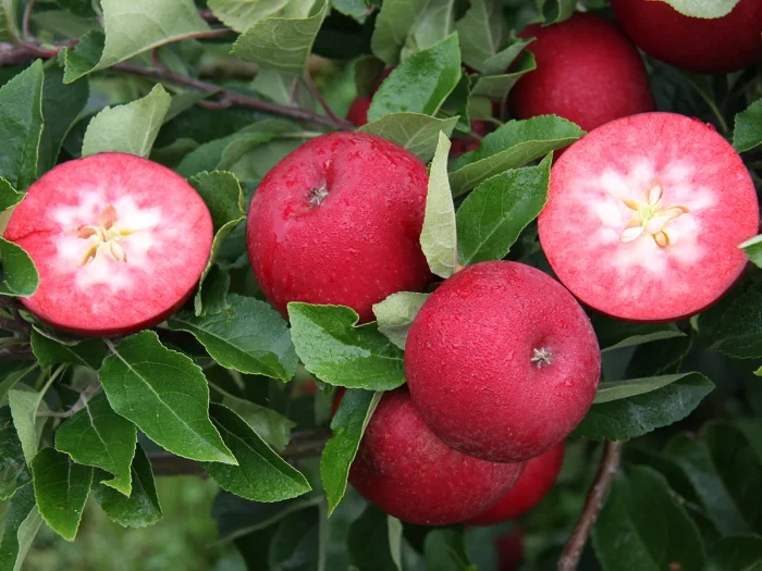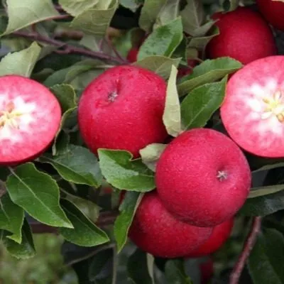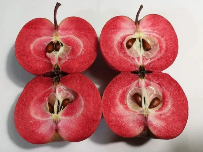 Главная отличительная черта сорта раскрывается при разрезании яблока. Мякоть имеет равномерную, интенсивную розово-красную окраску, которая распространяется от самой кожицы до сердцевины. Это стабильный сортовой признак, не зависящий от степени освещенности плода на дереве.