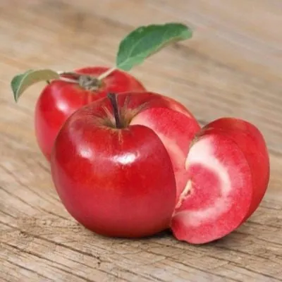 Такая мякоть не только эффектно выглядит в свежих нарезках и салатах, но и указывает на высокое содержание антоцианов — природных антиоксидантов. Вкус плодов сложный и утонченный, с выраженными ягодными тонами. Дегустаторы часто отмечают легкий микс, напоминающий лесные ягоды, такие как малина и черника, что выделяет Ред Пэшн среди сортов с традиционным яблочным вкусовым профилем. Аромат у плодов сильный и приятный.
