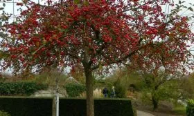 Настоящий праздник начинается осенью, когда после опадения листьев дерево полностью преображается. Его ветви буквально усыпаны многочисленными миниатюрными яблочками. Плоды крепко держатся на плодоножках, демонстрируя выдающуюся устойчивость к опадению.