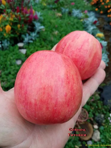 Плоды Сеянца титовки легко узнаваемы благодаря своей форме. Они не округлые, а имеют выраженную цилиндрическую, иногда сбежистую к вершине, форму. Средний вес в 80 граммов соответствует категории плодов среднего размера.