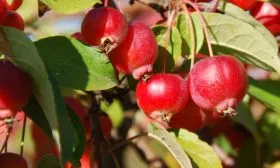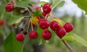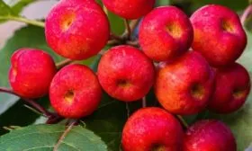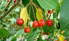 Главная отличительная черта сорта — его плоды. Они действительно мелкие, что и закрепилось в народном названии «ягодная». Их форма приближена к идеальному шару, а в состоянии съемной зрелости, которая наступает в конце августа или сентябре, кожица приобретает равномерную, насыщенную вишнево-красную окраску.