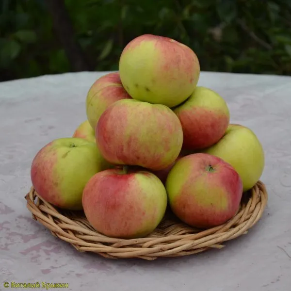 Плоды отличаются выровненностью по размеру и форме, что придает урожаю товарный вид. Их правильная округло-овальная форма и крупный вес (180-200 граммов) являются визитной карточкой сорта. Основная окраска в съемной зрелости — зеленовато-желтая, однако доминирующим является привлекательный размытый красный румянец, покрывающий большую часть поверхности яблока.