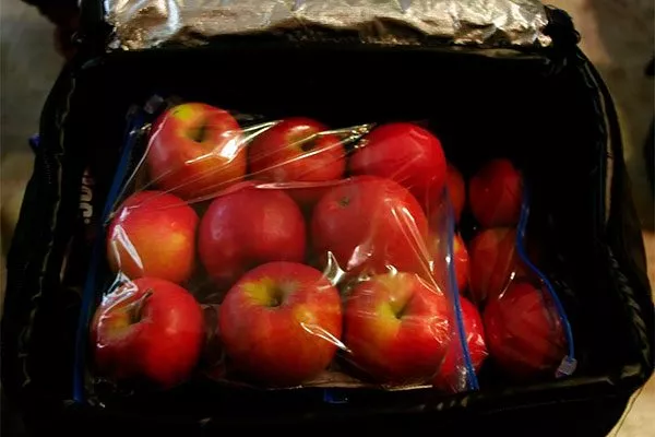 - В пакетах. В этом случае плоды помещаются в обычные полиэтиленовые пакеты по 2-3 кг в каждый. Их на 2-3 дня оставляют открытыми, чтобы яблоки испарили избыточную влагу. Затем пакеты плотно закрывают, удаляя из них воздух, и завязывают прочной верёвкой.