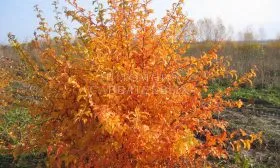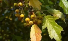 Осенний образ завершают плоды, которые, согласно характеристикам, являются мелкими. Их размер сопоставим с крупной вишней. Окраска соответствует описанию — это интенсивный темно-красный, почти бордовый цвет.