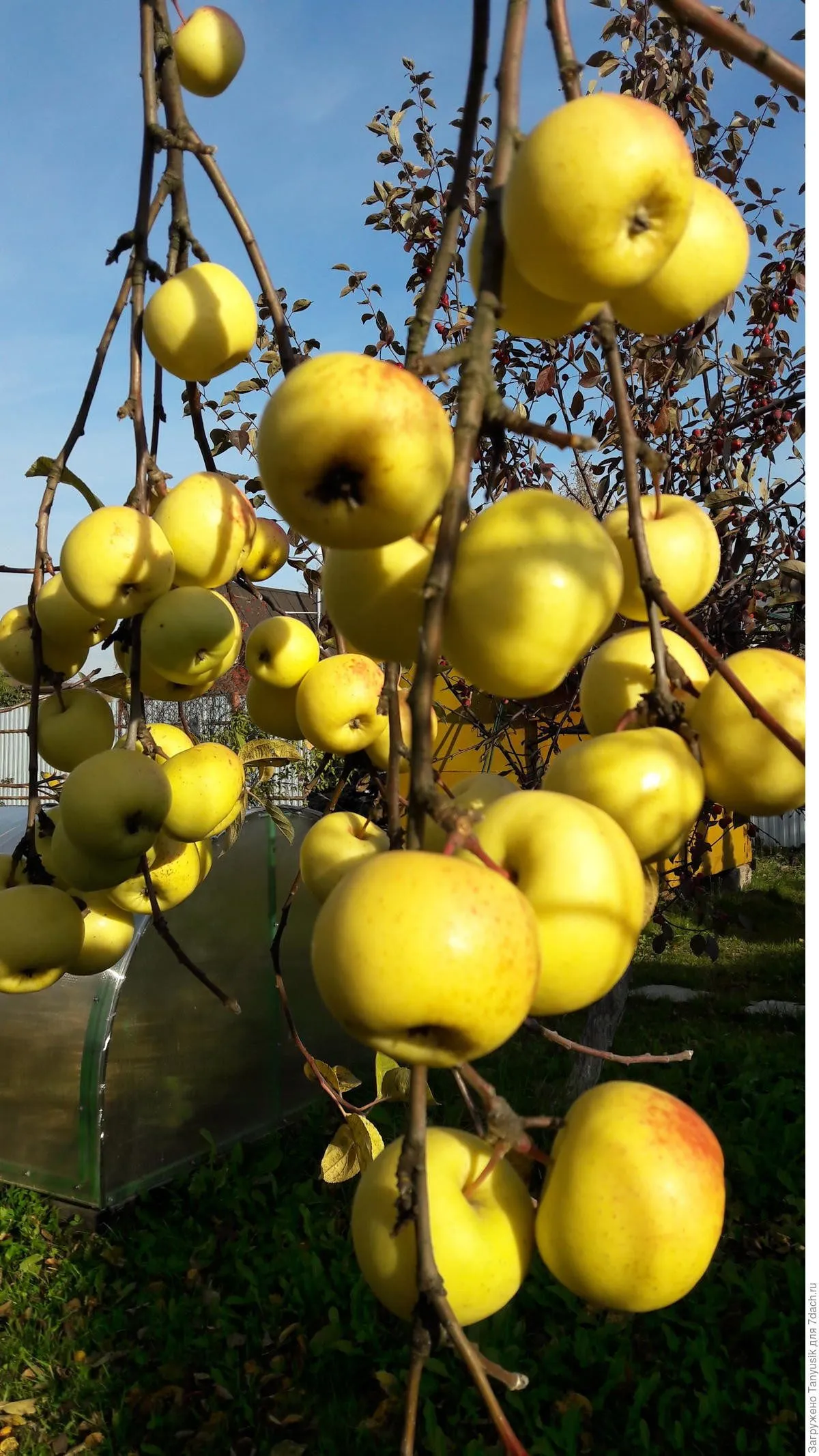 Подкожные точки мелкие, слабозаметные, что дополнительно подчеркивает чистоту и привлекательность желтого фона. Плодоножка средней длины и толщины, прочно удерживает даже полностью созревшее крупное яблоко, снижая риск осыпания.