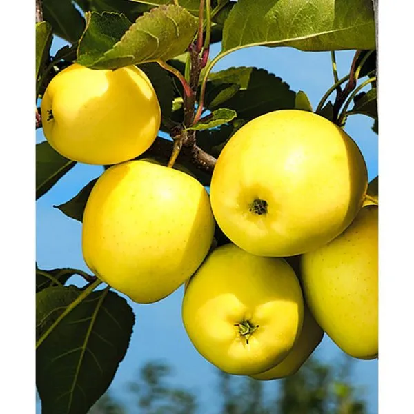 Плоды имеют средний размер и классическую округлую форму. Основная окраска кожицы — лимонно-желтая. На солнечной стороне может проявляться едва заметный, размытый красно-розовый румянец, но часто яблоки остаются полностью желтыми, что и дало сорту название.