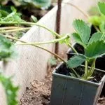 - Достаньте рассаду из контейнеров – её выдерживают в тени около 6 ч. Для посадки берут растения, выросшие из усов возрастом до одного года. Полейте рассаду за один час до посадки.
