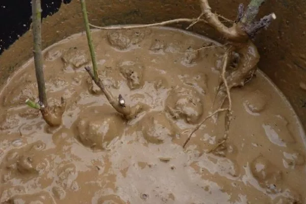 - Непосредственно перед посадкой корни саженцев опустите в раствор, состоящий из воды, глины, коровяка и гуматов.
