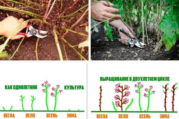 - Первую обрезку проводят весной. В этот период проводят санитарные мероприятия — удаляют подмёрзшие и поражённые вредителями ветви. Второй раз малину обрезают после сбора урожая — вырезают побеги-двухлетки.