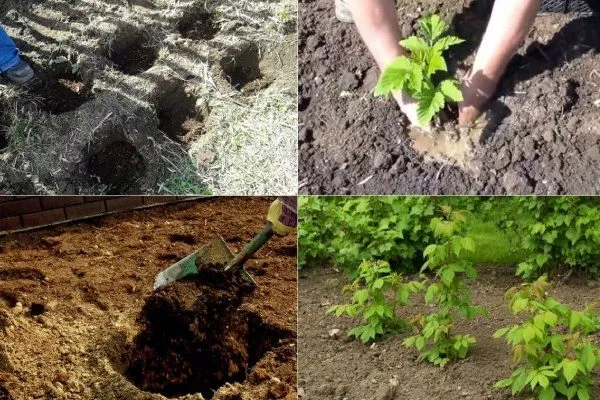 - Пересадите в заранее подготовленные для этого ямки нового малинника. Уровень корневой шейки саженца должен быть вровень.