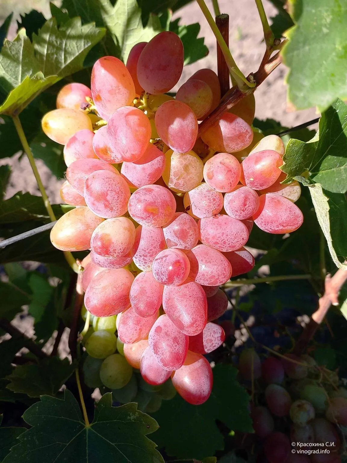 В затенении или при рассеянном свете ягоды демонстрируют яркий желто-розовый (двухцветный) окрас. Под прямыми солнечными лучами они равномерно набирают интенсивный ярко-розовый румянец, который может доходить до красного оттенка. Это важный сигнал для садовода: равномерная окраска всей грозди свидетельствует о полноценном освещении и, как правило, о лучшем накоплении сахаров.