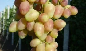 Ягоды привлекательной бело-розовой окраски, удлиненно-овальной формы со слегка заостренным кончиком. Их средний вес в 9.2 грамма относит плоды к категории крупных. Плотная, хрустящая мякоть заключена в кожицу средней толщины, что в совокупности с гармоничным вкусом и рыхлой гроздью обеспечивает хорошую транспортабельность собранного урожая.