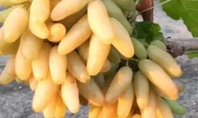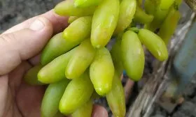 Внешний вид этого винограда не спутаешь ни с каким другим сортом. Главная его «визитная карточка» — удлиненные, слегка изогнутые ягоды, напоминающие миниатюрные бананы. Их уникальная форма является стабильным сортовым признаком и хорошо передается при вегетативном размножении.