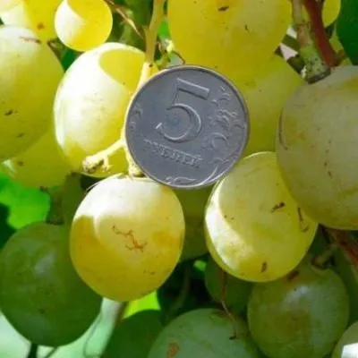 Главное украшение сорта — крупные, овальные ягоды весом 6-8 граммов. В полной зрелости они приобретают приятный бело-желтый, «янтарный» оттенок. Мякоть обладает характерной для сорта мясисто-сочной консистенцией.
