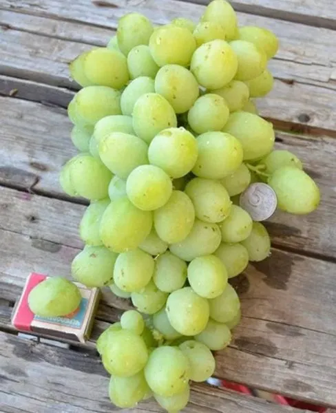 Виноград формирует крупные, часто ветвистые грозди конической или бесформенной формы. Их средняя плотность — важное достоинство: ягоды не деформируют друг друга, что снижает риск развития очагов гнили и улучшает товарный вид. Средний вес колеблется в заявленном селекционерами диапазоне от 589 до 800 граммов.