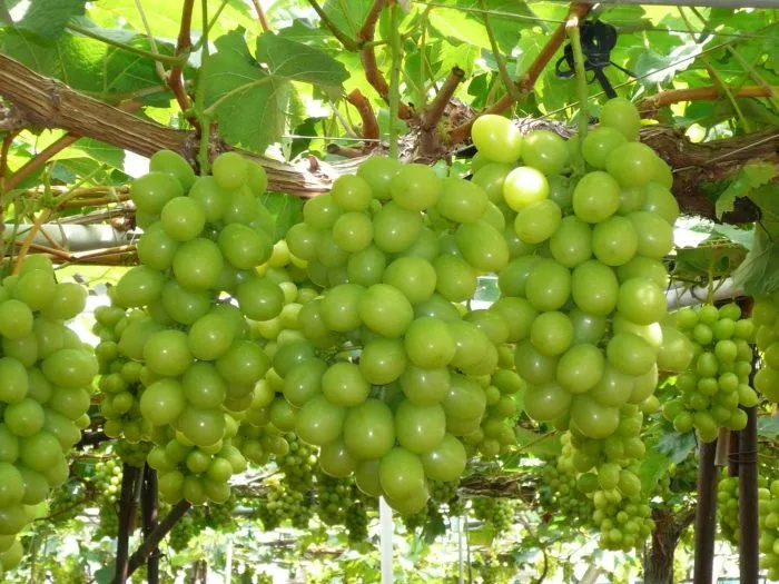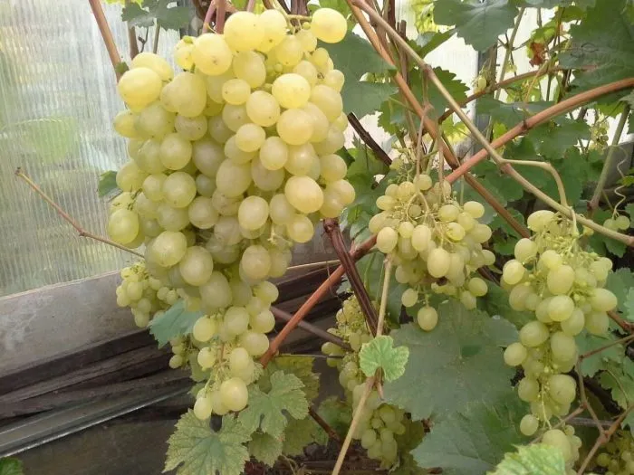 Результатом правильного ухода становятся впечатляющие грозди средней рыхлости, массой от 700 граммов до 1.2 килограмма. Ягоды крупные, овальной формы, белого цвета, каждая может достигать веса до 10 граммов. Вкус оценивается как гармоничный — сбалансированное сочетание сахара и кислоты без выраженных мускатных или травянистых тонов.
