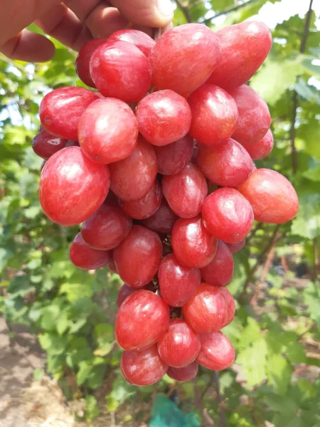 Ягоды очень крупные, их вес колеблется от 12 до 18 граммов. Под тонкой кожицей яркого розово-красного оттенка скрывается мясистая и хрустящая мякоть. Вкус гармоничный, с легким, но отчетливым мускатным тоном, который не переходит в приторность. Накопление сахара может достигать высоких показателей, в отдельных регионах до 27 г/100 см³ по шкале Brix, что подтверждает его десертный статус.