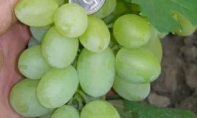 Главная гордость сорта — крупные, овальные ягоды массой 8-12 граммов каждая. Их кожица при еде практически не ощущается, что является ключевым достоинством для столового винограда. Основной окрас — чистый янтарно-желтый.