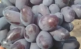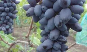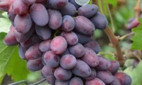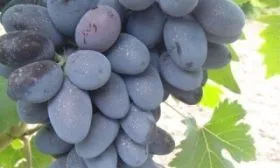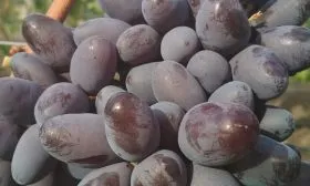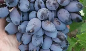 Ягоды – визитная карточка сорта. Их удлиненно-овальная форма и очень крупный размер (8–12 г) делают гроздь внешне привлекательной. Окраска при полном созревании становится темно-фиолетовой с выразительным бордовым оттенком и густым пруиновым (восковым) налетом, который выполняет защитную функцию.