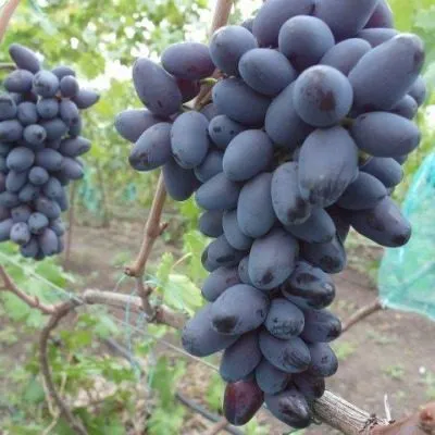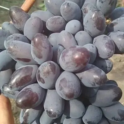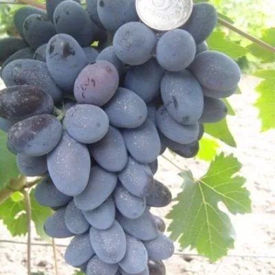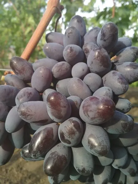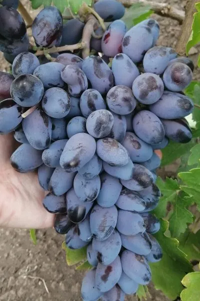 Ягоды – визитная карточка сорта. Их удлиненно-овальная форма и очень крупный размер (8–12 г) делают гроздь внешне привлекательной. Окраска при полном созревании становится темно-фиолетовой с выразительным бордовым оттенком и густым пруиновым (восковым) налетом, который выполняет защитную функцию.