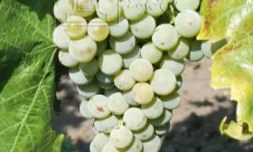 Ягоды округлые и выровненные, что придает грозди аккуратный, завершенный вид. В стадии технической спелости их окраска белая или бело-зеленая. Полное созревание раскрывает одну из характерных деталей: на ягодах, обращенных к солнцу, проявляется теплый кремово-желтый «загар». Этот румянец не только украшает гроздь, но и служит надежным визуальным индикатором оптимальной сахаристости.