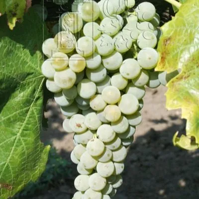 Ягоды округлые и выровненные, что придает грозди аккуратный, завершенный вид. В стадии технической спелости их окраска белая или бело-зеленая. Полное созревание раскрывает одну из характерных деталей: на ягодах, обращенных к солнцу, проявляется теплый кремово-желтый «загар». Этот румянец не только украшает гроздь, но и служит надежным визуальным индикатором оптимальной сахаристости.