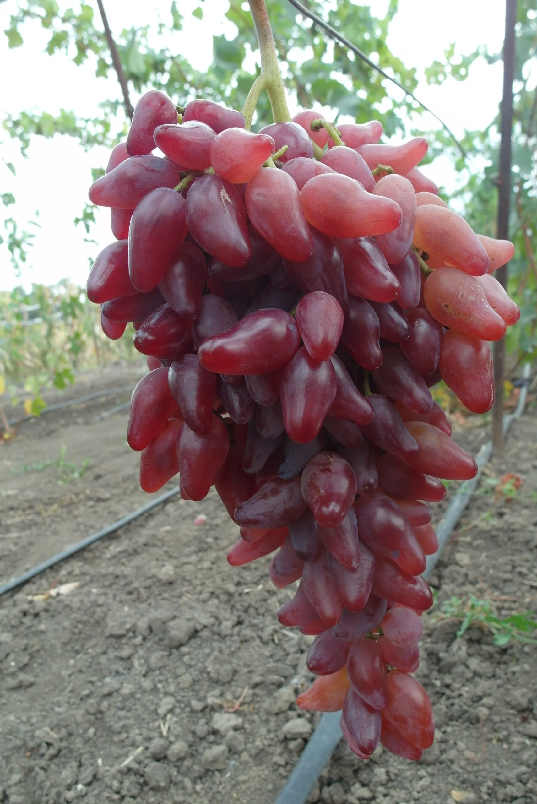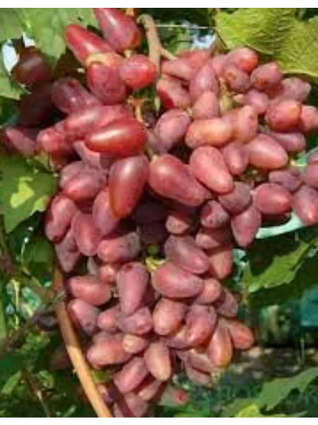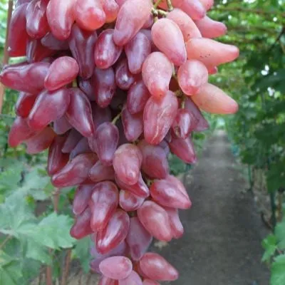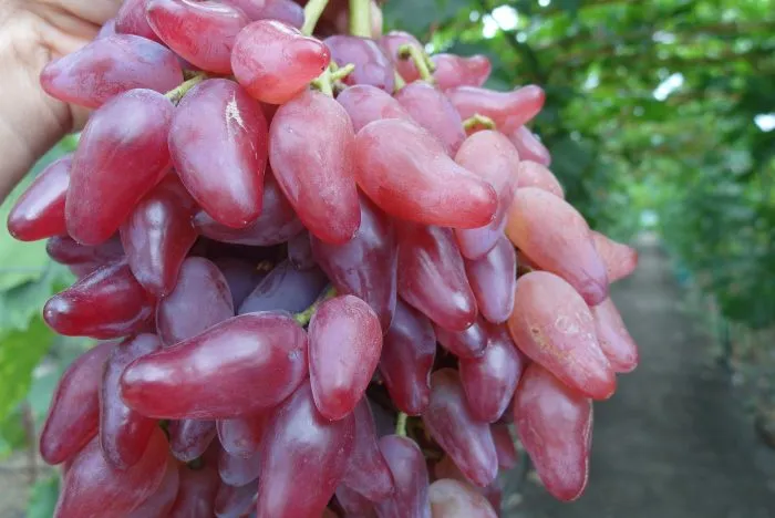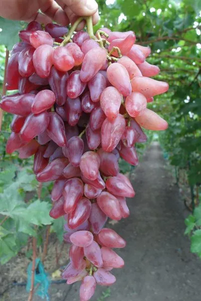 От родительской формы Софит новый гибрид унаследовал крупный размер ягод и мясисто-сочную консистенцию мякоти. Кишмиш Лучистый передал ему привлекательную ярко-красную окраску, тонкую, практически неощутимую кожицу и гармоничный вкус без выраженной кислотности. Однако ключевая отличительная черта – уникальная сосковидная, слегка изогнутая форма ягоды – является собственным приобретением сорта, что делает его легко узнаваемым.
