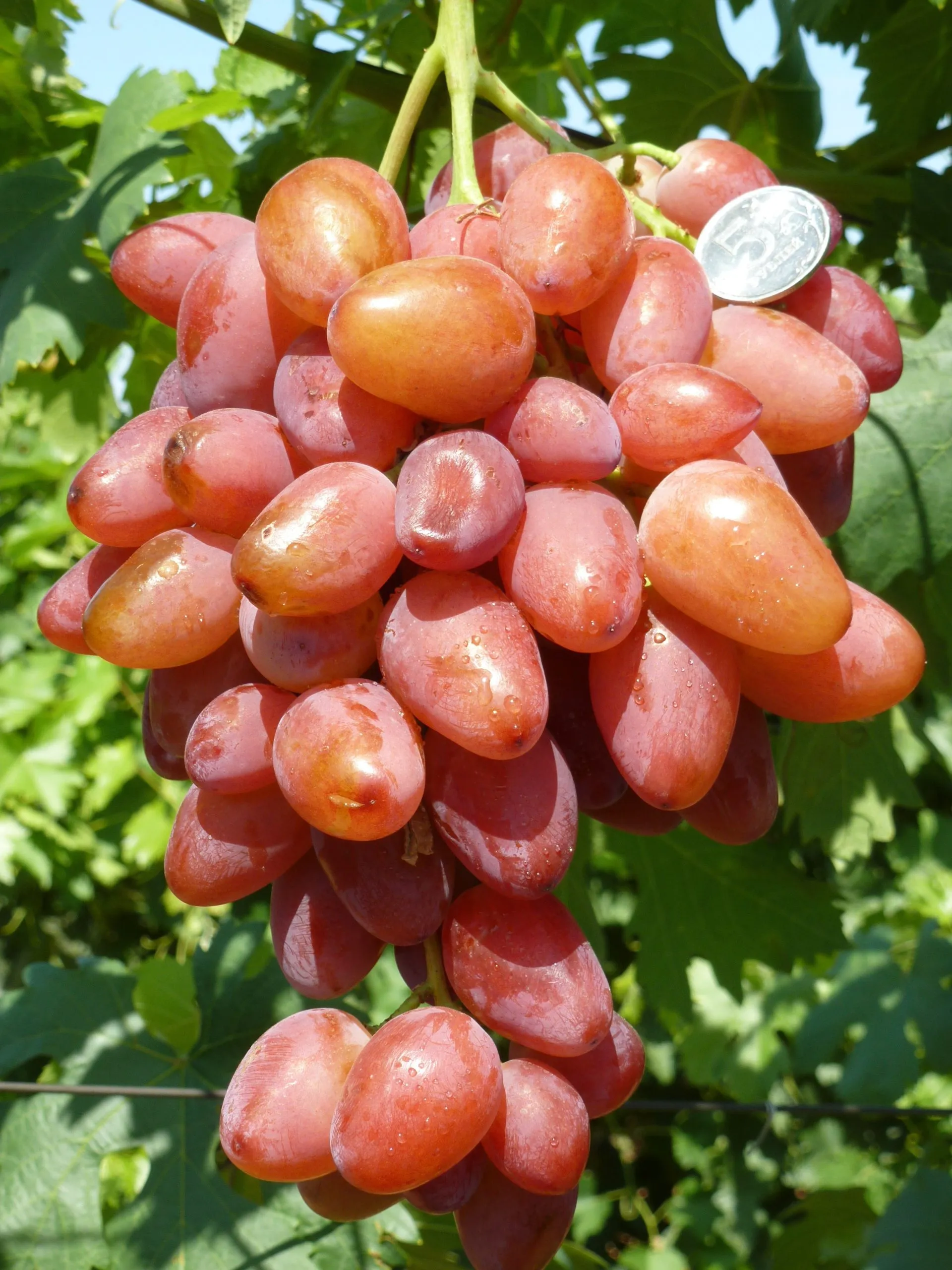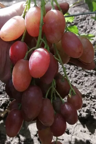 Грозди крупные, рыхлые или средней плотности, что является преимуществом, так как снижает риск поражения гнилями внутри кисти. Ягоды очень крупные, овально-яйцевидной формы, с привлекательной розовой или желто-розовой окраской.