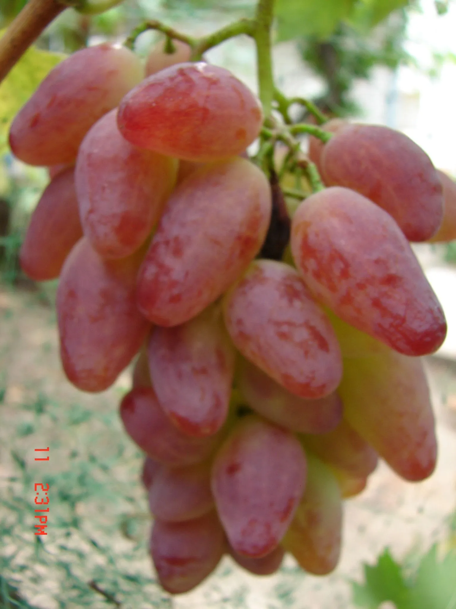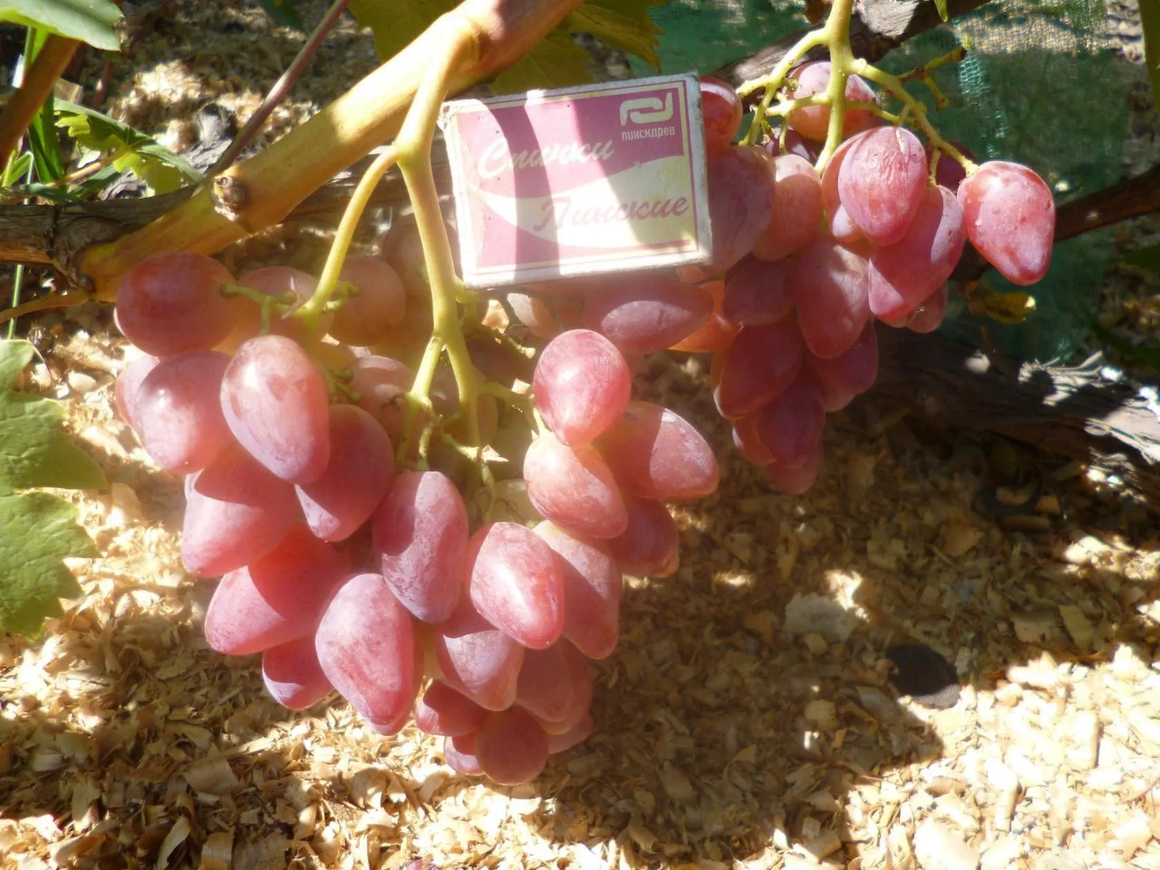 Главная отличительная черта сорта – его крупные ягоды весом 10-14 граммов. Их форма не просто удлиненная, а именно сосковидная с характерным заостренным кончиком, что делает гроздь очень узнаваемой. Окраска сложная и зависит от степени освещенности: в тени ягоды могут оставаться желто-розовыми, а на солнце набирают интенсивный розово-малиновый «загар». Это создает эффект перелива цвета в пределах одной грозди.