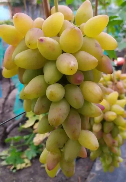 Окрас в состоянии полной потребительской зрелости сложный и привлекательный. Основной фон — янтарно-желтый, на который на солнечной стороне накладывается нежный розовый «румянец». Интенсивность этого румянца напрямую зависит от степени освещенности грозди в период налива и созревания.