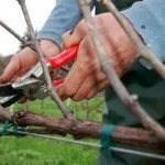 - На второй год обрезку проводят весной – до того как распустятся почки. На лозах оставляют по 3 глазка – в нижней части. К осени на кусте должно вырасти не менее трёх крепких лоз – их привязывают к шпалере. Промежутки между ярусами – 30-40 см.