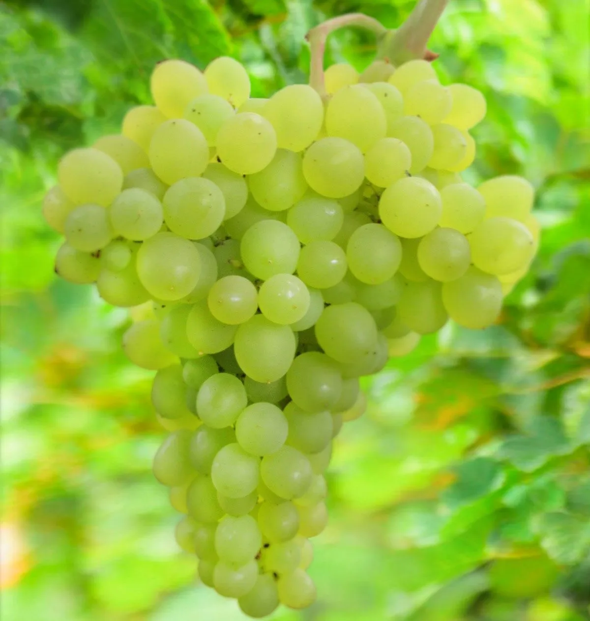 Внешний вид плодов этого сорта — его визитная карточка, привлекающая внимание как на рынке, так и на кусте. Ягоды имеют привлекательный желто-зеленый оттенок, который на хорошо освещенных гроздях к полной зрелости может переходить в теплый, почти янтарный цвет. Такая игра цвета делает кисть особенно нарядной.