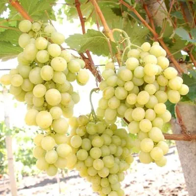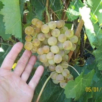Окраска кожицы описывается как янтарно-белая. На практике это означает светлый, теплый желтоватый оттенок, который на хорошо освещенных гроздях может переходить в более насыщенный золотистый. Этот эффект часто называют «загаром».