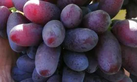 Главная отличительная черта сорта — уникальная форма и размер ягод. Их удлиненно-овальные плоды с характерным заостренным кончиком, часто описываемые как «пальчиковые», в виноградной коллекции встречаются нечасто. Средний вес в 8,7 грамма подтверждает их крупноплодность.
