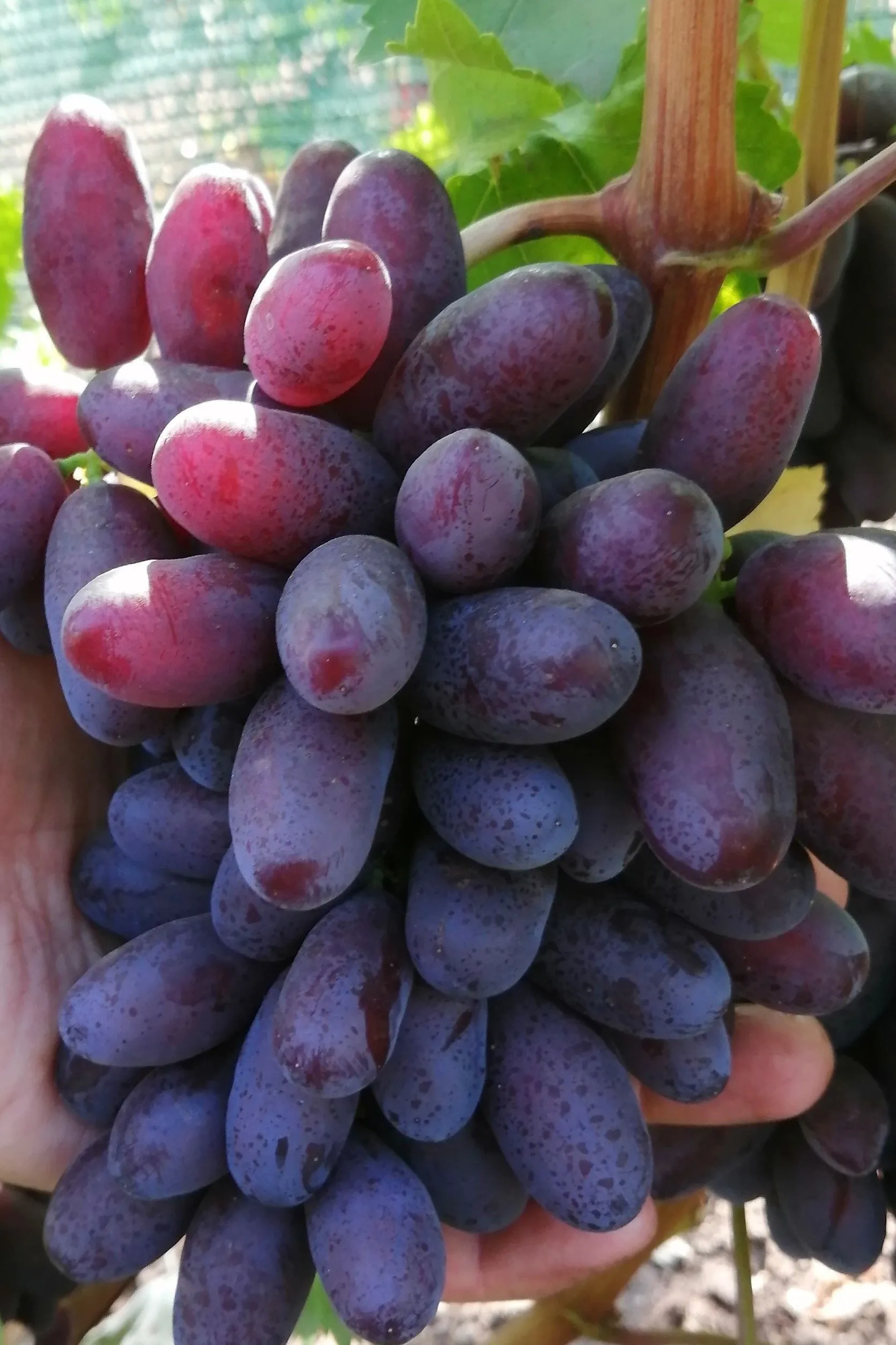 Главная отличительная черта сорта — уникальная форма и размер ягод. Их удлиненно-овальные плоды с характерным заостренным кончиком, часто описываемые как «пальчиковые», в виноградной коллекции встречаются нечасто. Средний вес в 8,7 грамма подтверждает их крупноплодность.