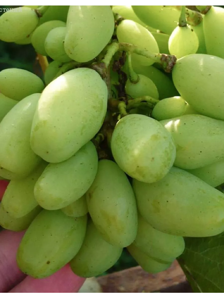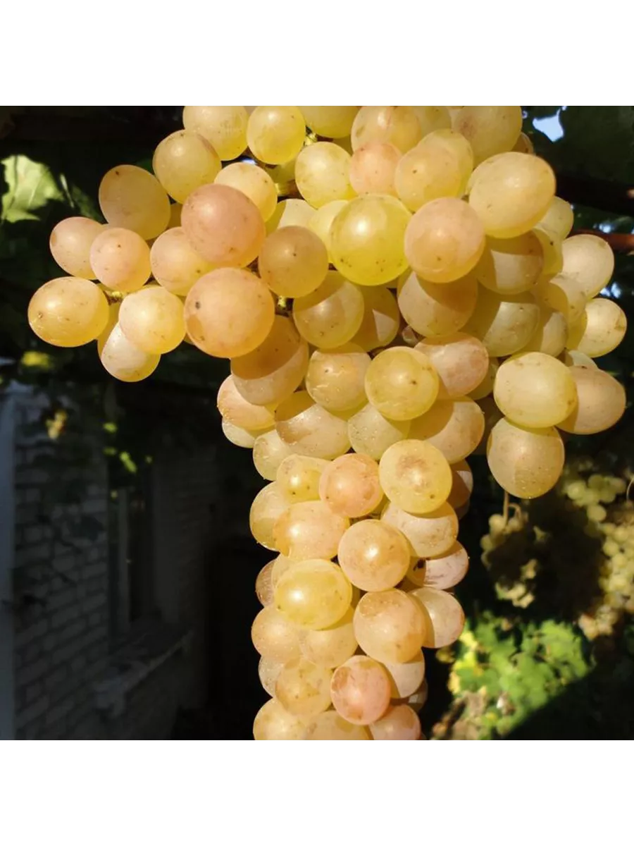 Ягоды привлекают внимание своей удлиненной, яйцевидной формой и крупным размером, достигающим в среднем 6 граммов. Основной окрас при полной зрелости — янтарно-белый. Характерной видовой чертой является появление на солнечной стороне нежного розового румянца, так называемого «загара», который делает гроздь особенно нарядной.