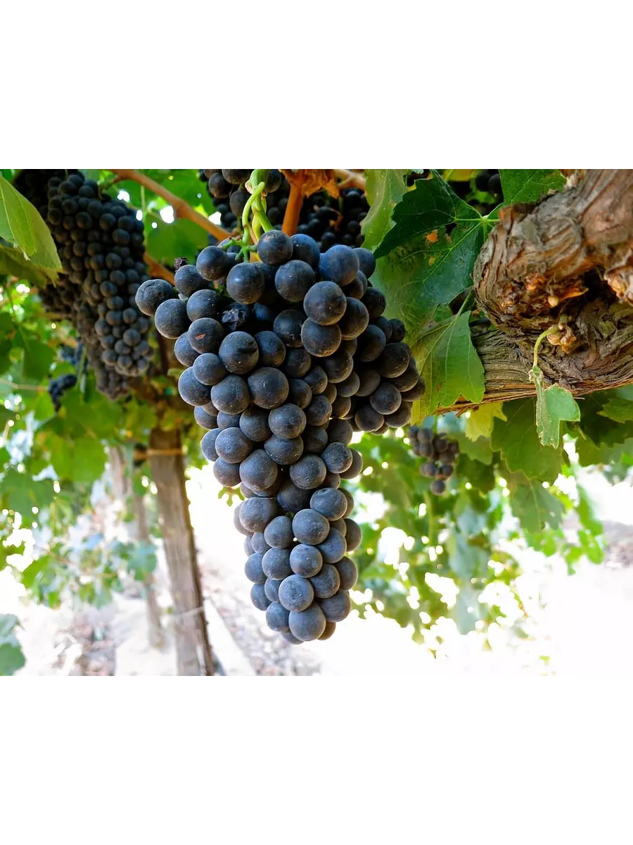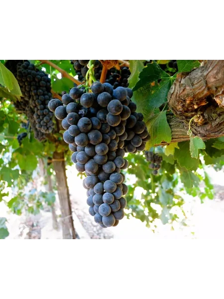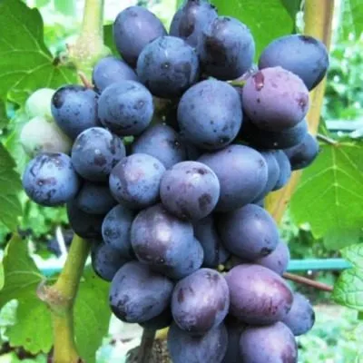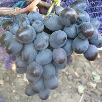 Окрас — один из самых насыщенных в палитре винограда. В фазе полной зрелости ягоды приобретают цвет от глубокого черного до иссиня-черного. Их поверхность обильно покрыта естественным пруиновым налетом (восковым слоем). Этот голубоватый налет придает ягодам матовый, бархатистый оттенок, усиливая визуальную глубину цвета и делая гроздь особенно привлекательной.