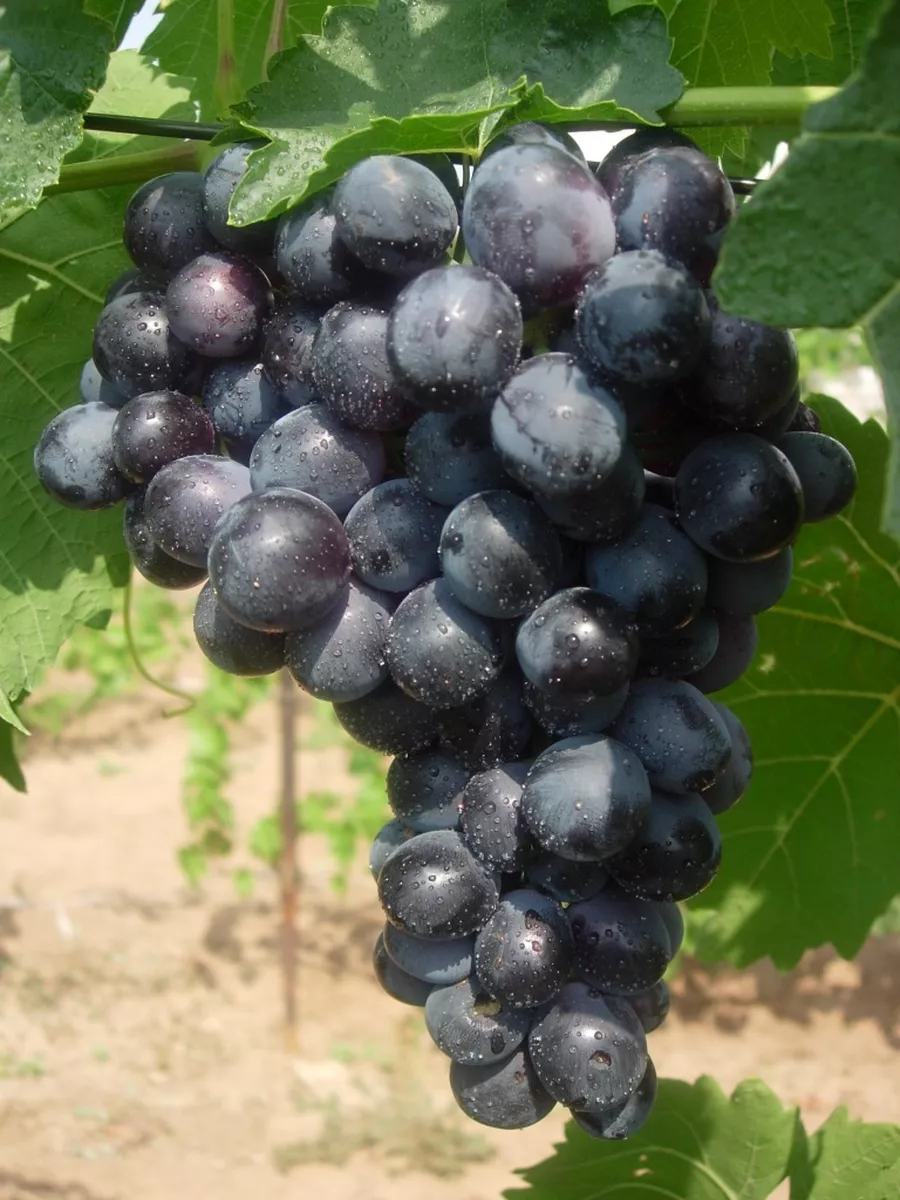 Именно ягоды — главная гордость этого сорта. Они привлекают внимание насыщенным, темно-фиолетовым цветом, который в полной зрелости кажется почти черным. Этот глубокий оттенок дополнительно подчеркнут густым слоем природного воскового налета, или пруина. Пруин выполняет не только декоративную функцию — он служит естественным барьером, защищающим кожицу от механических повреждений и испарения влаги.