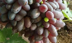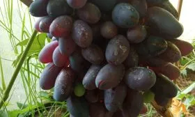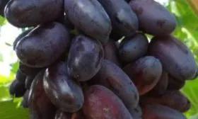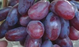 Темно-красно-фиолетовые, удлиненно-овальные ягоды с восковым налетом имеют привлекательный товарный вид. Кожица средней толщины при еде не ощущается, что повышает потребительские качества. Грозди довольно рыхлые или средней плотности, что является плюсом, так как снижает риск поражения гнилями внутри кисти.