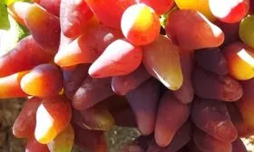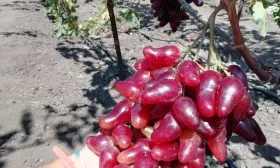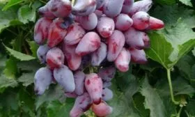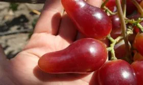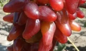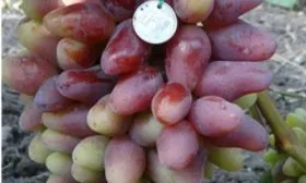 Внешний вид плодов является визитной карточкой сорта. Удлиненно-овальная, часто сосковидная форма с насыщенным малиновым окрасом делает грозди очень презентабельными. Ягода крупная, ее средний вес около 11 граммов, что подтверждается взвешиванием.